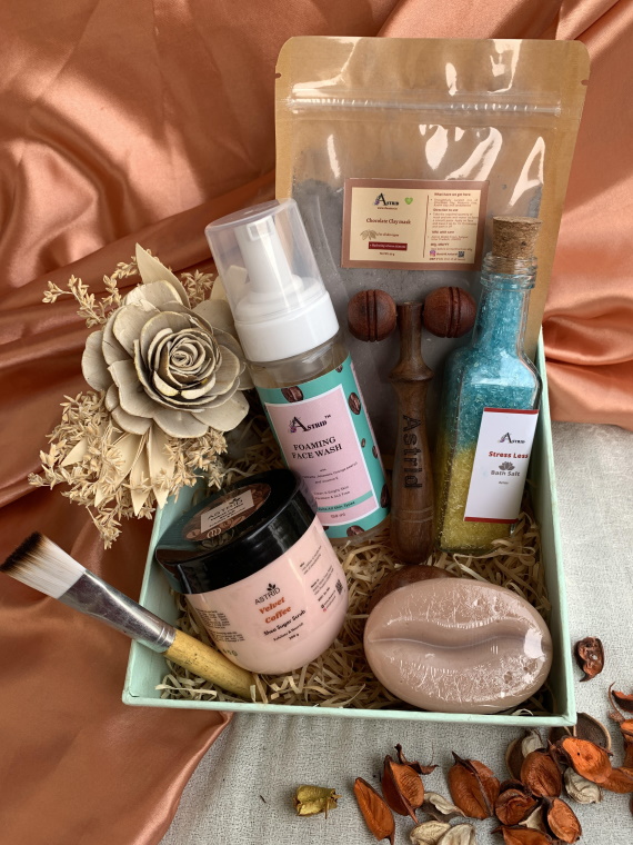 Astrid Coffee Exfoliation gift set, Coffee, Set of 7, Woody and Earthy, Coffee Bath and Body Care, Wellness Spa hamper, Bridesmaid hamper, Paraben and Sulphate free