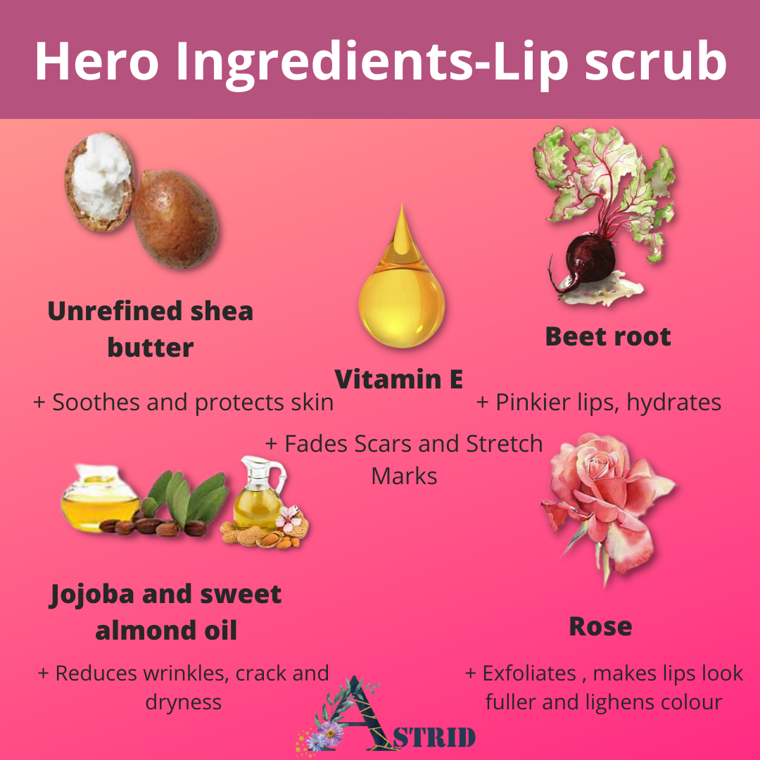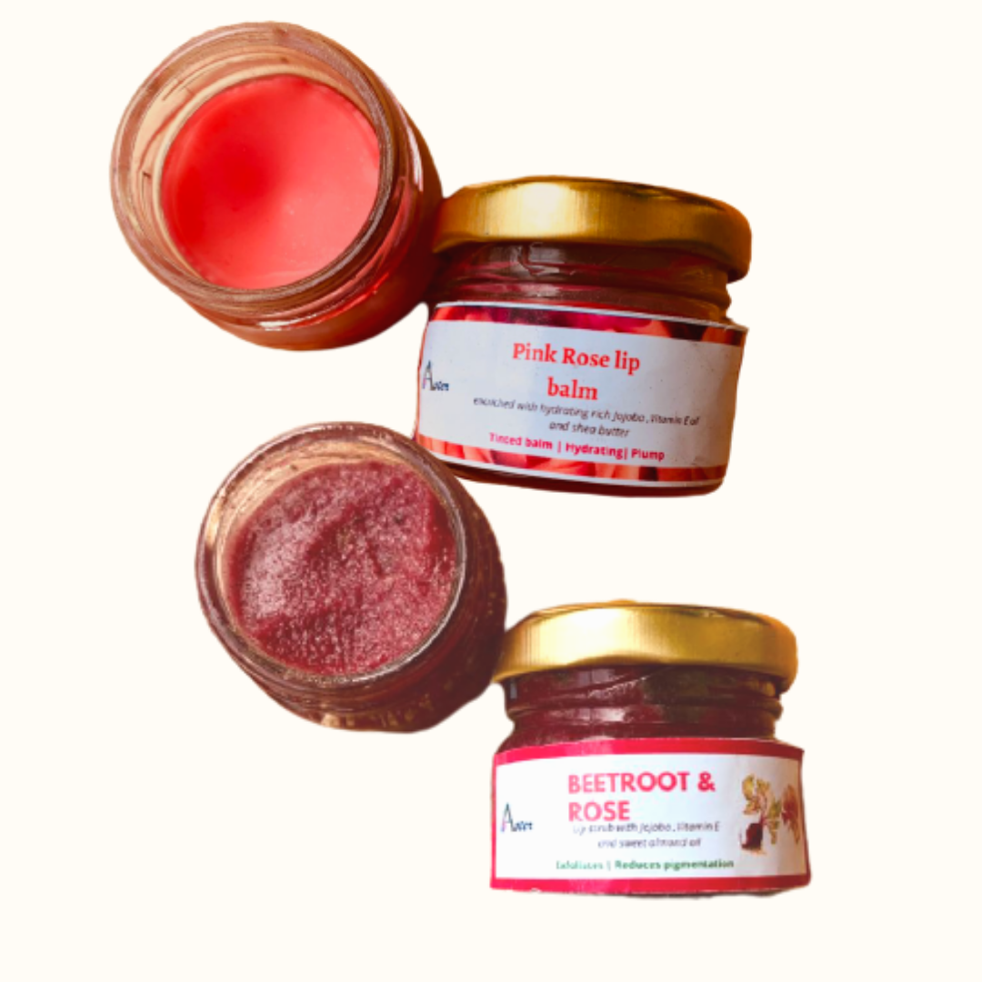 This combo contains Astrid beet and rose lip scrub and baby pink lip balm/ lip tint. These products are enriched with naturally derived ingredients that exfoliates and hydrates lips naturally. The lip scrub has goodness of superfoods such shea butter, mango butter and cold processed oils such as sweet almond oil, Jojoba oil and Vitamin E.