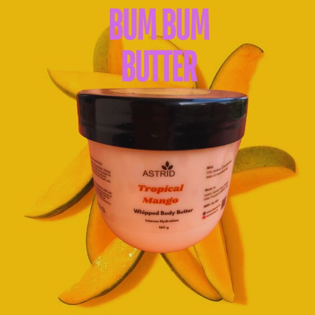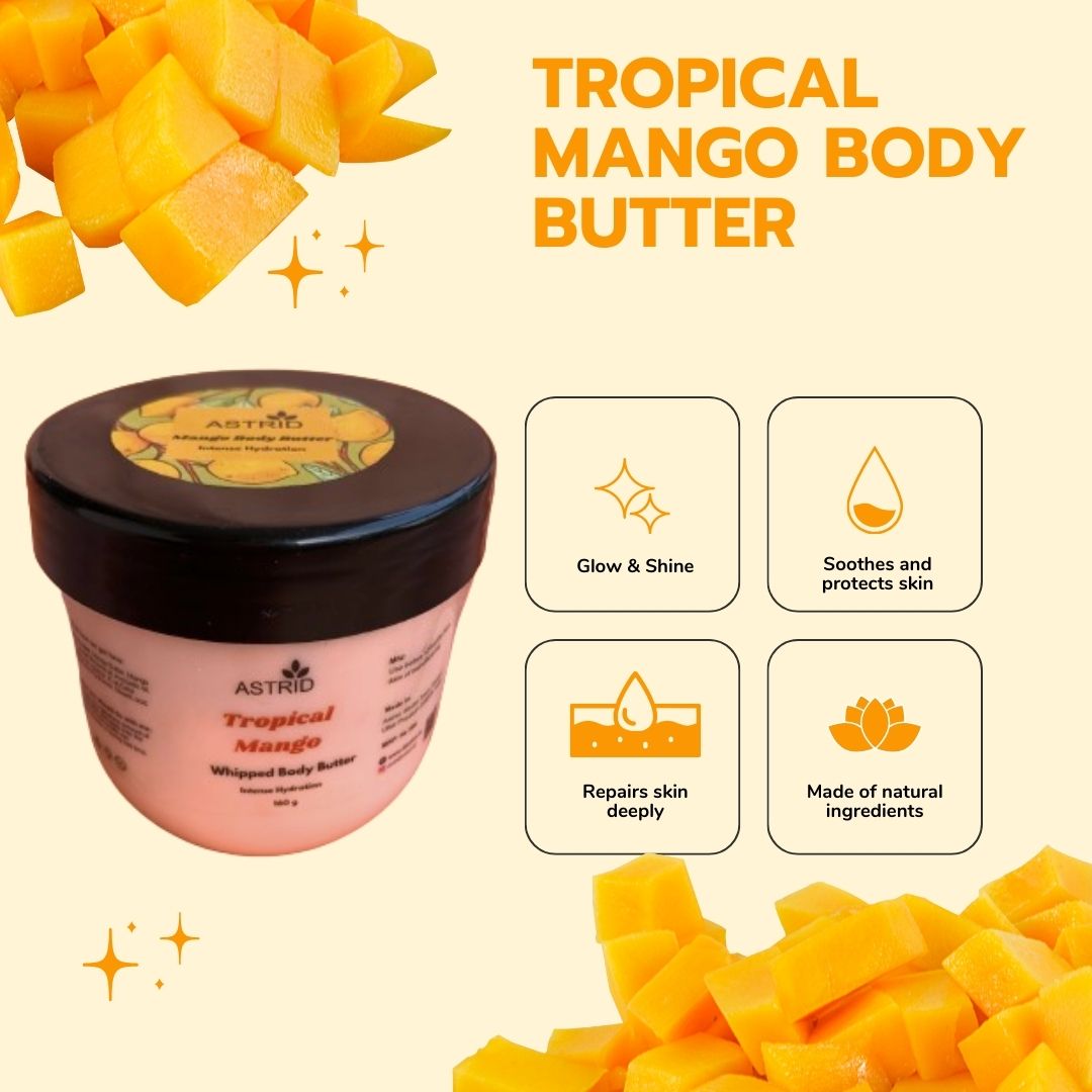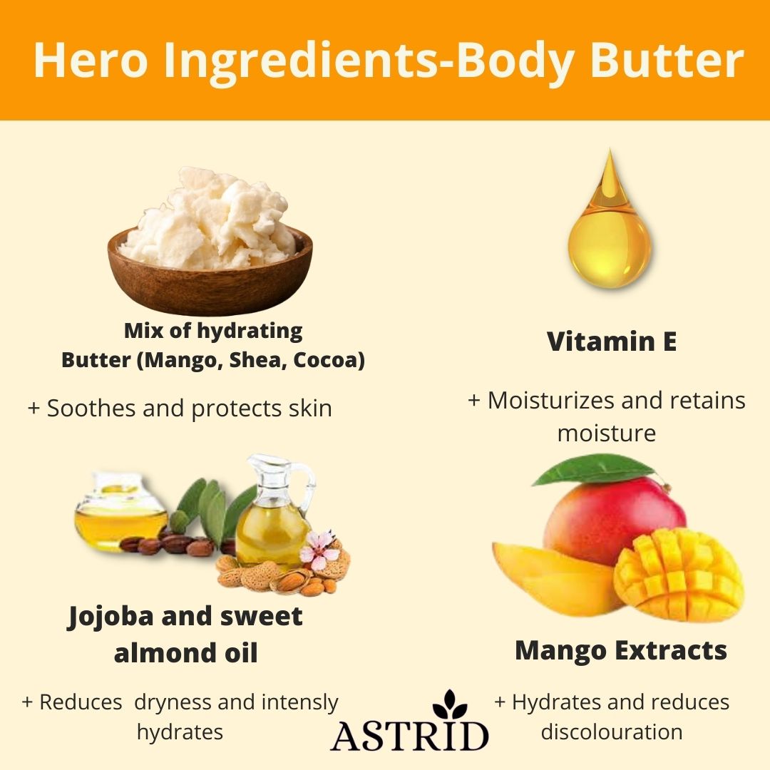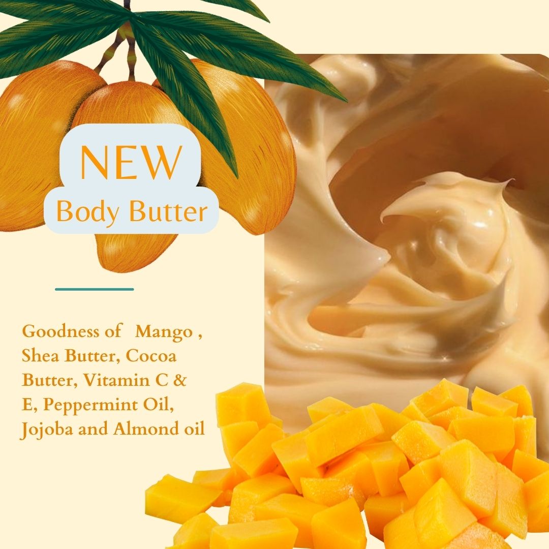 Mango Body Butter, Natural Body Butter, Mango, Shea, Cocoa Butter, Mango extracts, Almond oil, intense hydration, reduced stretchmark, stimulates collagen, 160 GMS, No Parabens and sulphate, All skin type