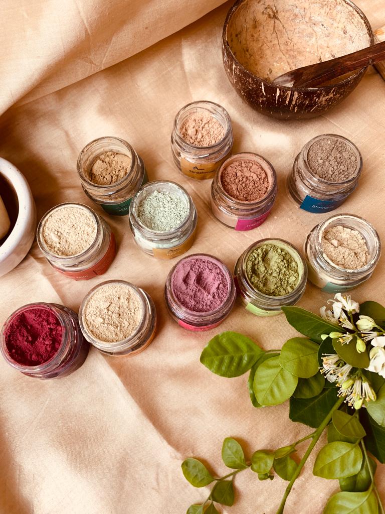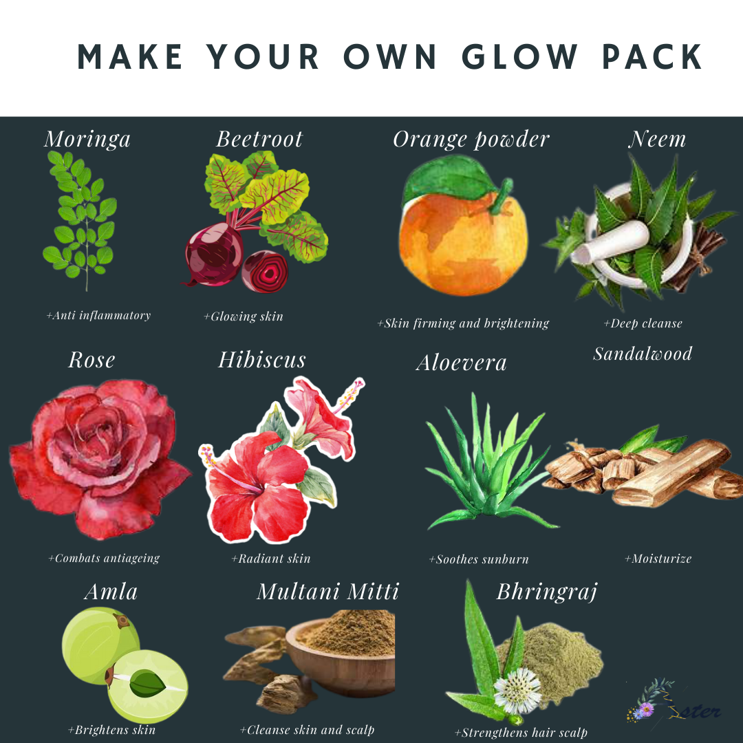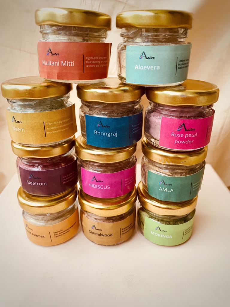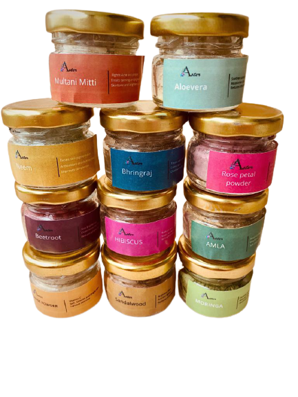 Aster natural glow masking kit contains six gentle, 100% natural, vegan, preservative free clay/herbal powders designed for daily use DIY products such as Ubtans, face, body and hair mask, lip scrub, lip balms etc. These clays are superfood for skin and have very high nourishing value.